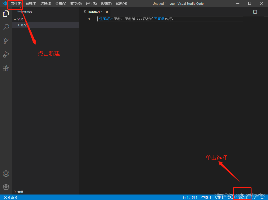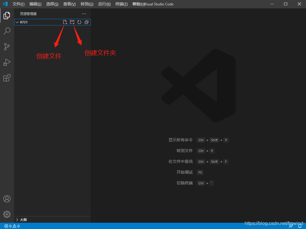 4.1首先在电脑上创建文件夹,也就是项目的名称,打开vscode并打开之前创建的文件夹,如下页面,此时就可以在根目录下创建新文件夹了