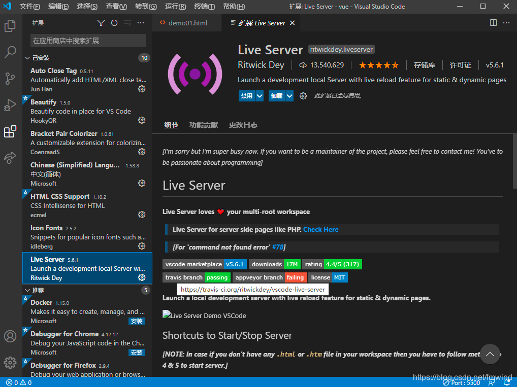 3.6 Live Server(在 vscode 中就可以直接启动一个本地服务,并且能监听文件变化自动刷新网页)