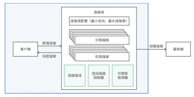 大家接触最多的连接池、大概是数据库连接或者tomcat连接池,C3P0、DBCP、Tomcat Jdbc Pool、BoneCP、Druid等。这些连接池的目的都非常的纯粹,即在服务启动的时候,预先生成若干条连接,每当有请求过来,就从中取出一个,执行操作,执行完成后再放回,从而避免反复的建立和销毁连接,以提升性能。