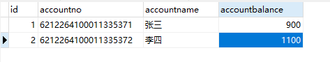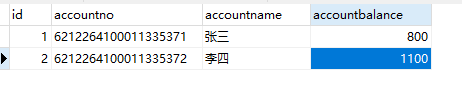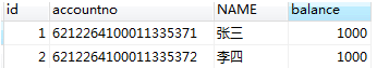 #账户表 create table account( id int primary key auto_increment, account_no varchar(50), account_name varchar(50), account_balance float ); #测试数据 insert into account(account_no,account_name,account_balance)VALUES(‘6212264100011335371’,‘张三’,1000); insert into account(account_no,account_name,account_balance)VALUES(‘6212264100011335372’,‘李四’,1000); COMMIT;