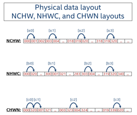 对NHWC,存储时按【CWHN】,从000沿C方向存020,040等,之后沿W方向存001、021等,再沿H方向,最后沿N。