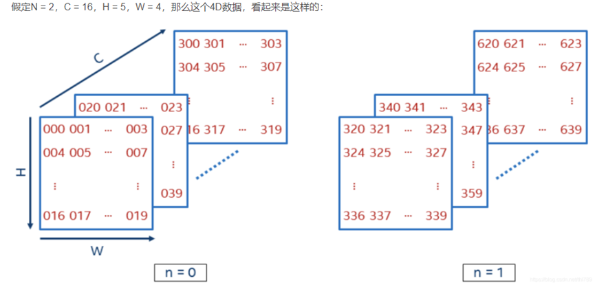 对于NCHW,存储时是【WHCN】,从001开始沿着W方向知道003,再沿H方向挨个存004、005、006,直到019,存完第一张沿C方向按同样方式存第二张,最后沿N方向重复上述操作。
