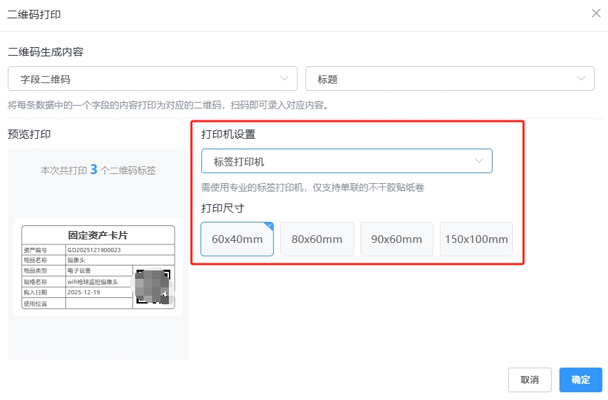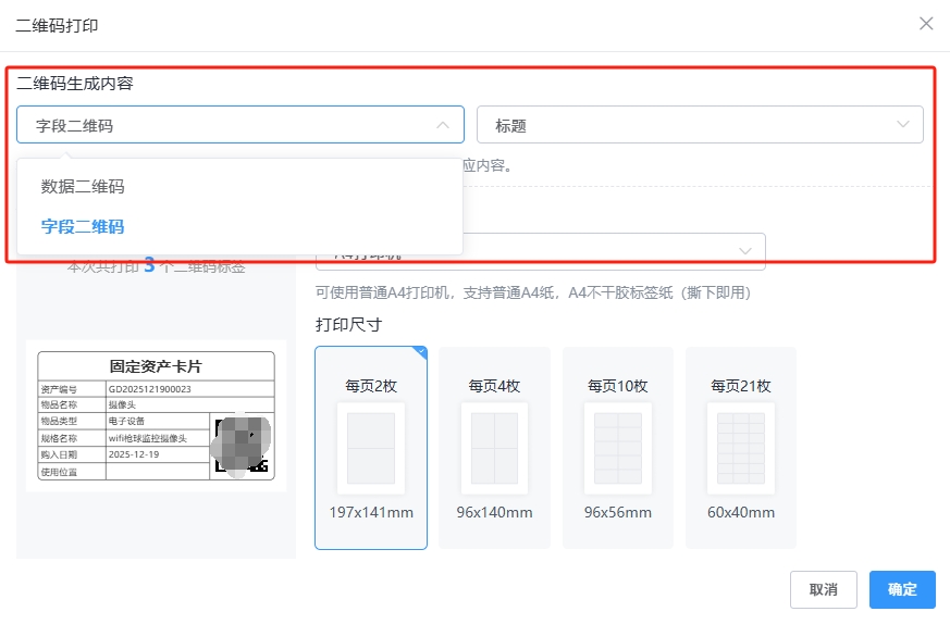 步骤3:选择二维码类型。按需选择两种模式:“数据二维码”(扫码查完整信息,适配溯源)或“字段二维码”(移动端连续扫码录入,适配盘点/出入库)。
