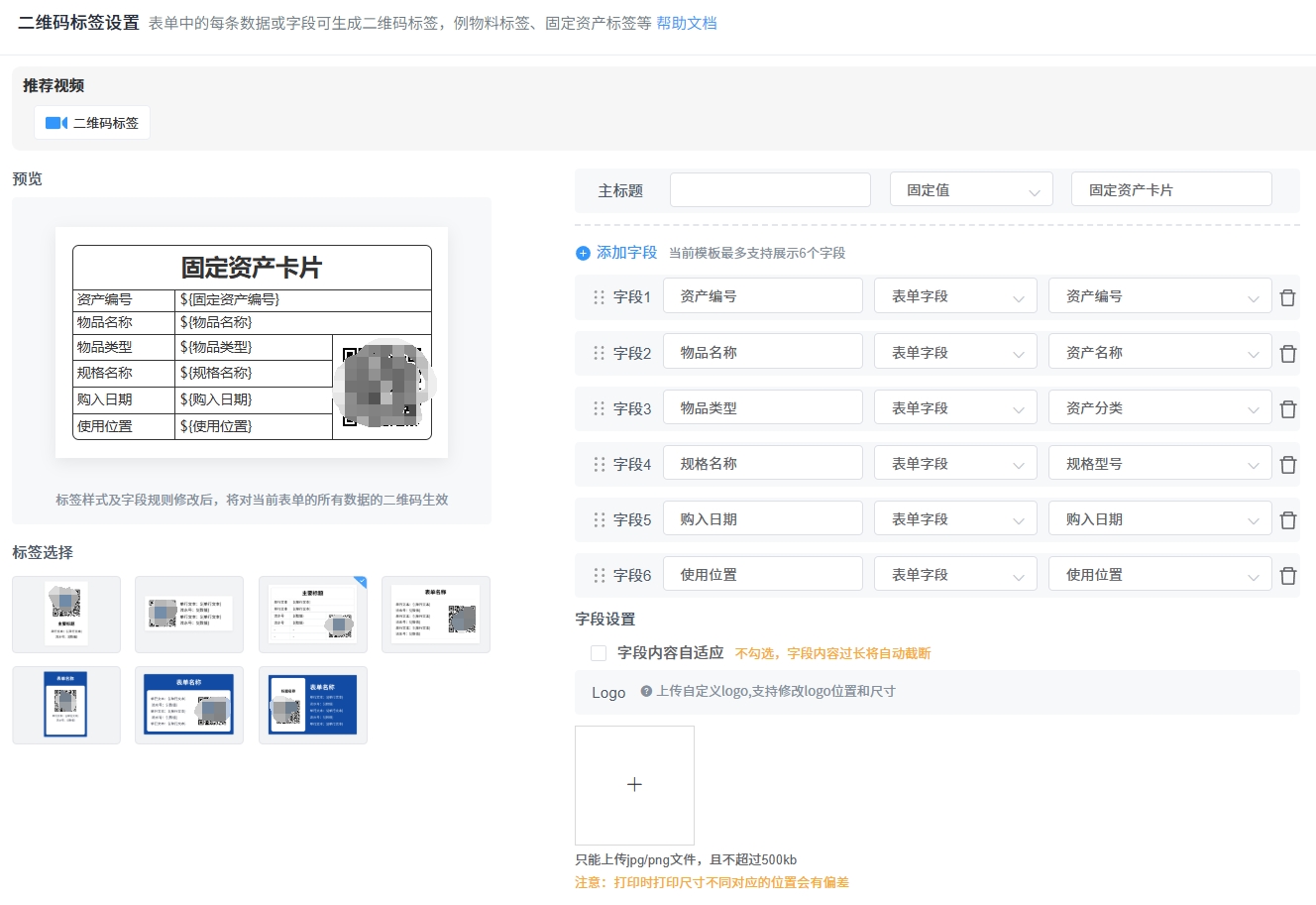 步骤1:表单设置与模板自定义(同一功能页面,一步完成)。打开搭贝后台表单设置,找到“二维码标签”模块,添加需打印的字段(支持多种类型,过长系统自动截断);接着选择内置7种标签模板(按物品类型挑选),可 自定义主副标题、标签尺寸、添加LOGO,预览满意即可,无需设计基础。