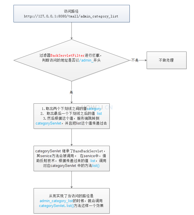 让我们借助流程图来分析,为什么访问admin_category_list的时候,CategoryServlet的list()方法会被调用