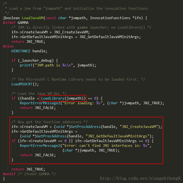 LoadLibrary方法装载JVM.dll动态连接库;把JVM.dll文件中定义的函数JNI_CreateJavaVM和JNI_GetDefaultJavaVMInitArgs绑定到InvocationFunctions变量的CreateJavaVM和GetDefaultJavaVMInitArgs函数指针变量上