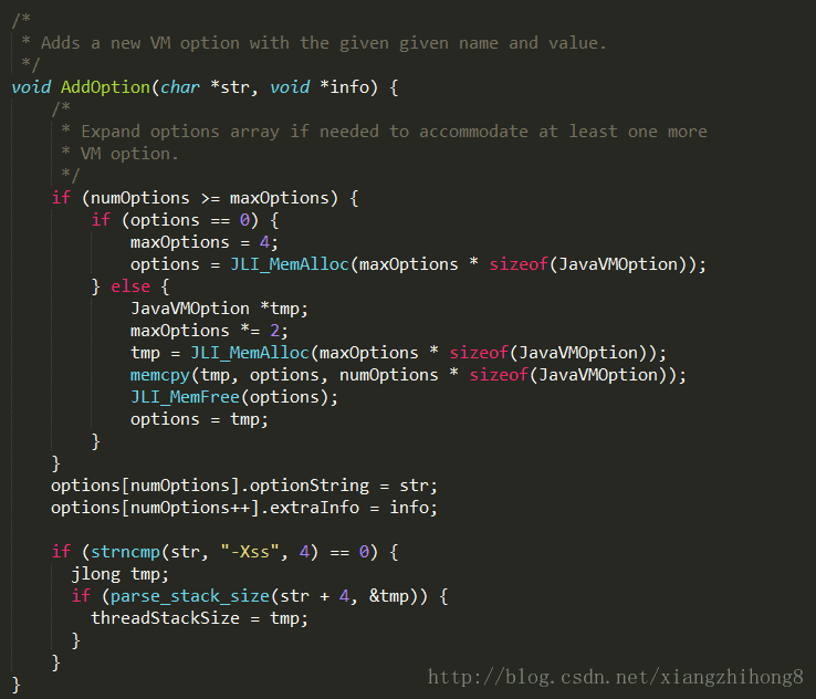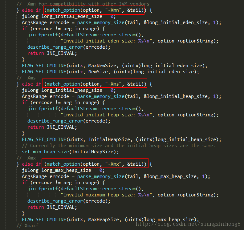 Arguments::parse_each_vm_init_arg方法负责处理经过解析过的JavaVMOption数据,部分实现如下。这里列出了JavaVMOption三个常用的参数:-Xmn:设置新生代的大小NewSize和MaxNewSize;-Xms:设置堆的初始值InitialHeapSize,也是堆的最小值;-Xmx:设置堆的最大值MaxHeapSize;