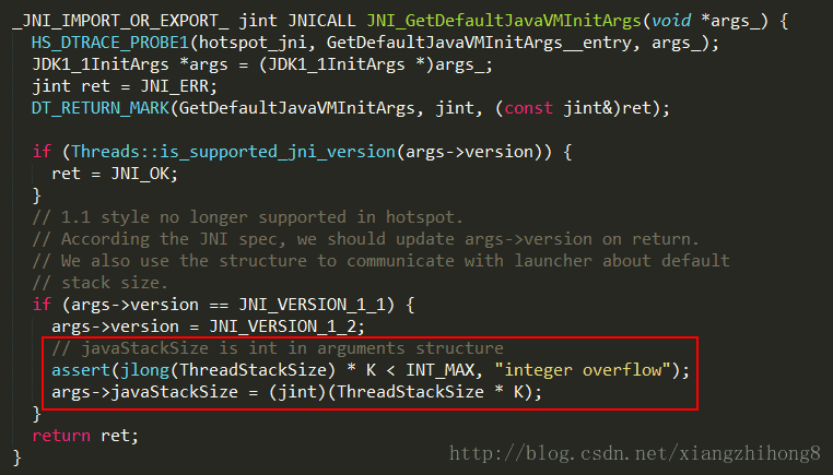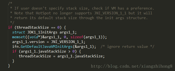 调用JVM.dll函数JNI_GetDefaultJavaVMInitArgs,定义在share\vm\prims\jni.cpp,实现如下。ThreadStackSize定义在globals.hpp中,根据当前系统类型,加载对应的配置文件,所以在不同的系统中,ThreadStackSize的默认值也不同。