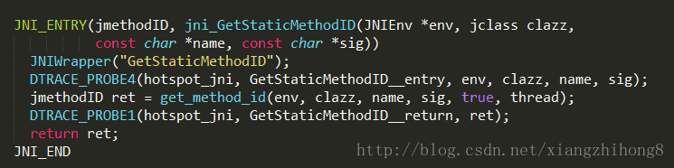 查找main方法:通过GetStaticMethodID方法查找指定方法名的静态方法,最终调用JVM.dll函数jni_GetStaticMethodID实现。其中get_method_id方法根据类文件对应的instanceKlass对象查找指定方法。