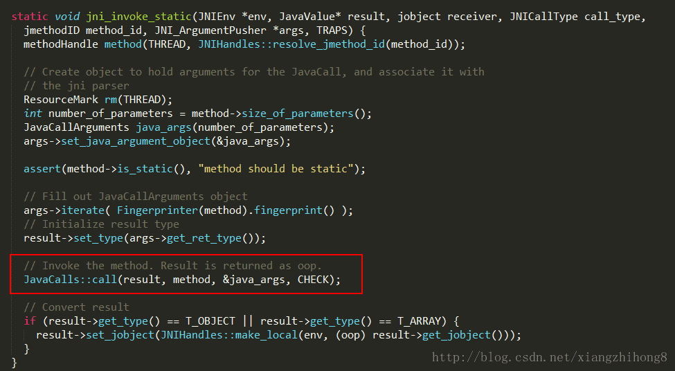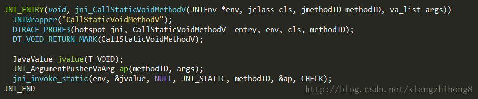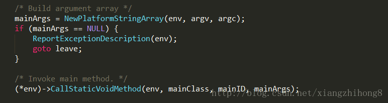 执行main方法:重新创建参数数组。其中mainID是main方法的入口地址,CallStaticVoidMethod方法最终调用JVM.dll中的jni_CallStaticVoidMethodV函数。最终通过JavaCalls::call执行main方法。
