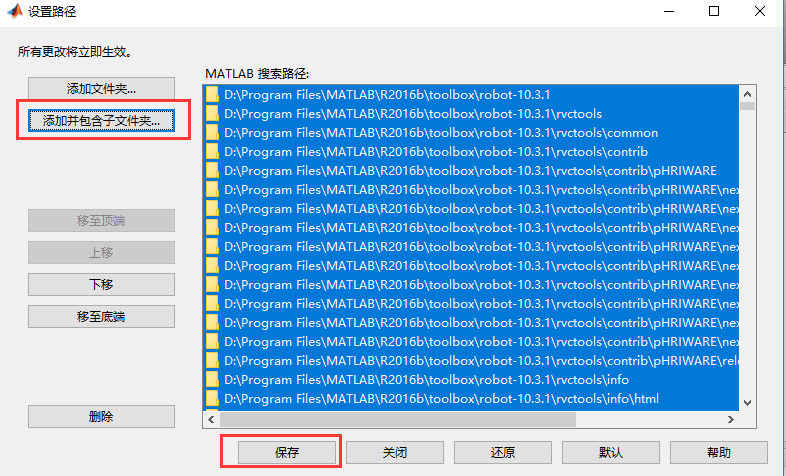 3、打开matlab点击主页、设置路径、添加并包含字文件夹,然后选择robot-10.3.1文件夹,点击保存后点击关闭设置路径窗口