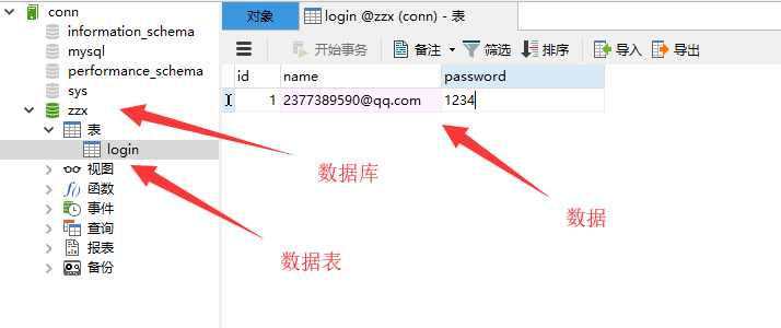 在安装好MySQL数据库的前提下,我创建一个名为zzx的数据库,数据表为login 具体数据如下