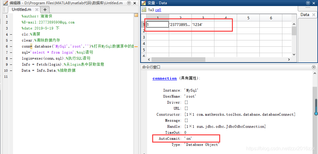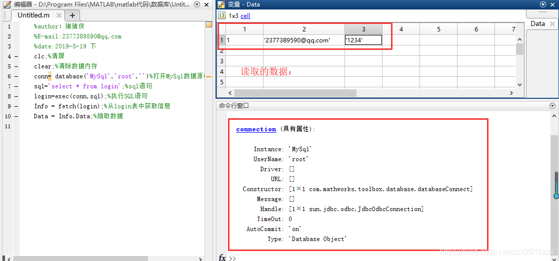 运行结果:命令窗口和Data数据显如下情况则显示连接成功