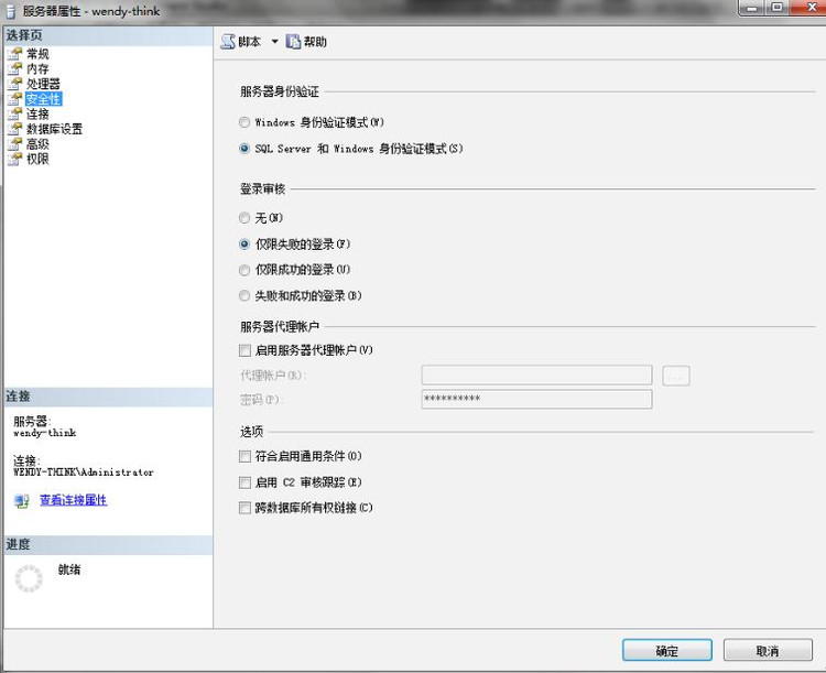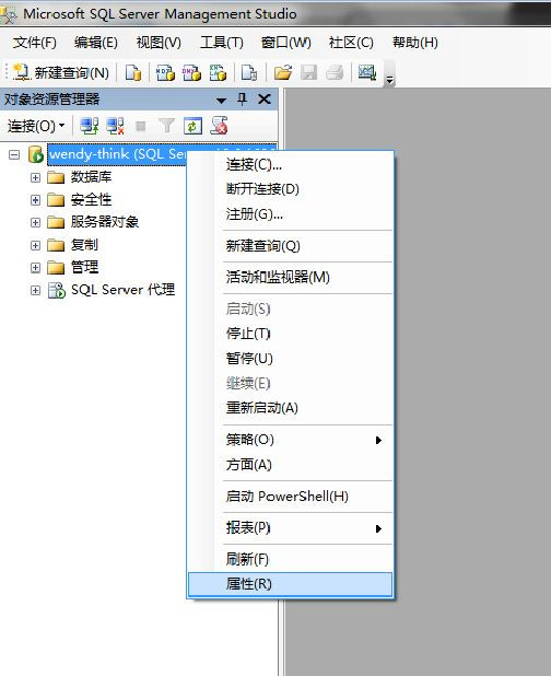 1、先用Window身份验证方式登陆进去,选择数据库实例,右键选择属性——安全性:把服务器身份验证选项从“Window身份验证模式”改为“SQLServer和Window身份验证模式”。点击确定,关闭当前对象资源管理器。