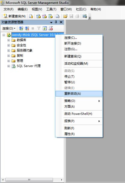 具体方法是在数据库实例上点右键,选择“重新启动”项即可。最后关闭sql server2008,启动后用sa登陆。
