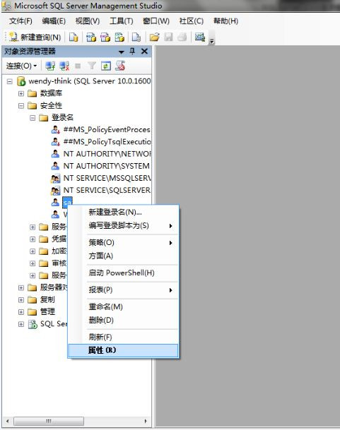2、 重新用Window验证方式登陆,在左边的树结构中选择“数据库”下面的“安全性”选项——登录名——sa,右键属性——在“SQLServer身份验证”中输入要设置的sa密码。