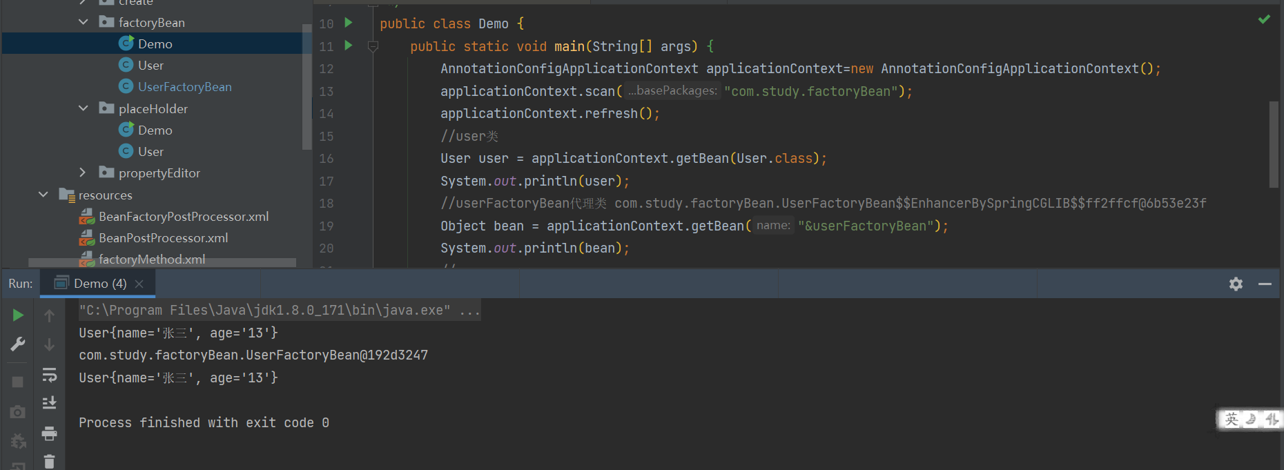 //指定包扫描路径 applicationContext.scan("com.study.factoryBean"); applicationContext.refresh(); //user类 User user = applicationContext.getBean(User.class); System.out.println(user); //userFactoryBean代理类 com.study.factoryBean.UserFactoryBean$$EnhancerBySpringCGLIB$$ff2ffcf@6b53e23f Object bean = applicationContext.getBean("&userFactoryBean"); System.out.println(bean); //user Object user1 = applicationContext.getBean("userFactoryBean"); System.out.println(user1); } }