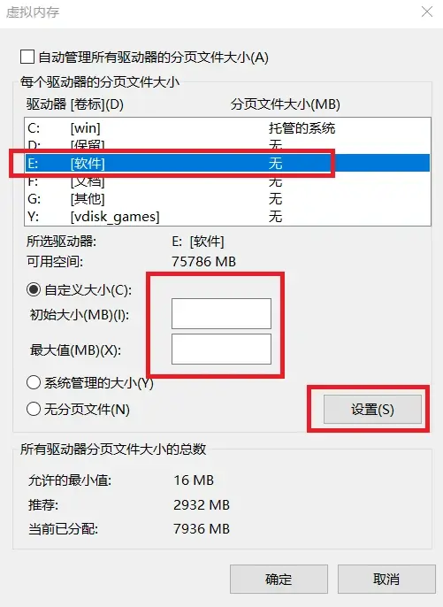 选择自定义大小 初始大小和最大值相同 虚拟内存设置大小参考: