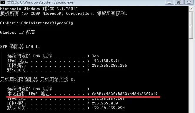 查看当前使用的网卡是否有 本地链接 IPv6 地址