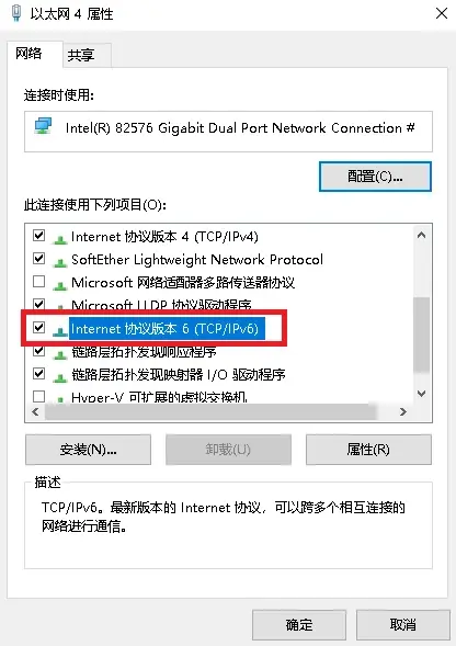 查看 Internet协议版本 6 (TCP/IPv6) 是否勾选上