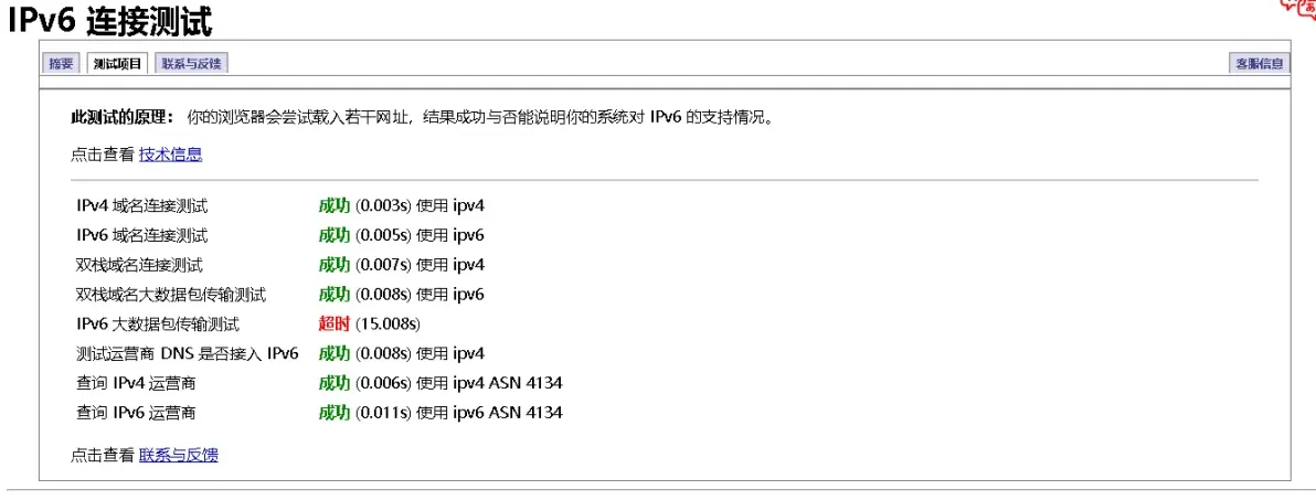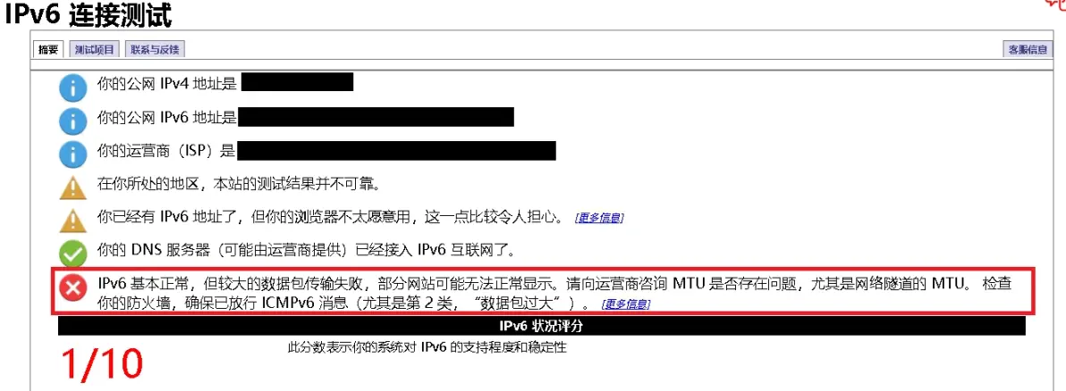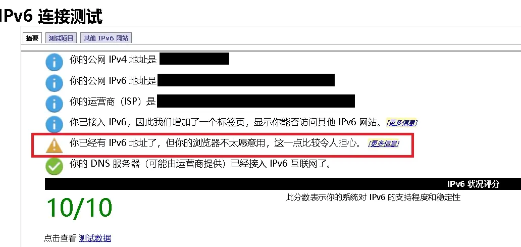也可以访问一下IPv6测试网站 https://testipv6.cn/ 评分应达到10/10