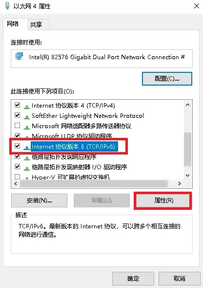 按照上文 2.2.4.1 节中的方法找到 网卡上的 IPv6协议 点击属性