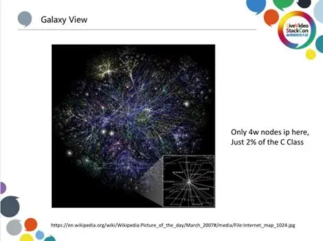 如果将网络中所有IP的连接渲染成可视化的图,则如上图所示,其中仅包含四万个连接 关系,就看起来就像是一个星系一样丰富繁杂。而以爱奇艺当前的业务规模,每时每刻 都会有几千万的HCDN节点这样连接着,并且节点的热度状态都是变化的,如果将它们 渲染出来,就会形成一张非常庞大的星系动图。