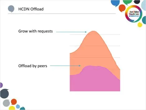上图是两个图叠加在一起,上面的是P2P带宽,下面的是CDN带宽。可以看出,到了晚高峰,CDN带宽不再往上涨,但是P2P带宽还在上涨,如果把它叠加起来,意味着晚高峰用户量还是在上涨的,如果没有HCDN的P2P机制来Offload这些带宽的话,这些带宽叠加到CDN上是非常高的,是非常重的一个压力和成本负担。