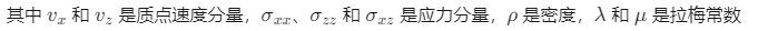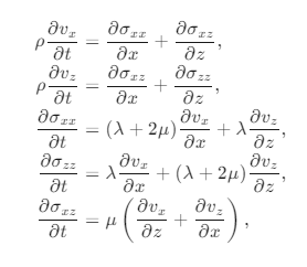 在弹性波数值模拟中,通常使用一阶速度-应力方程来描述波的传播。对于二维各向同性介质,弹性波方程可以表示为:
