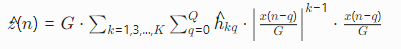 y(n) = y(n) + h((k+1)/2,Q+1-q) * abs(x(n-q)/G).^(k-1) * x(n-q)/G;