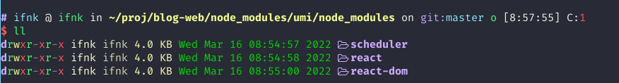 于是看了下 ~/proj/blog-web/node_modules/umi/node_modules 这个路径 ,ls 一下