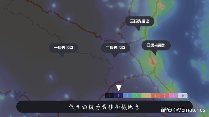 首先,拍摄地点要远离光污染的城区。你可以在“天文通”网站上查看当地光污染指数,其中绿色表示为四级光污染,低于四级为最佳拍摄地点。