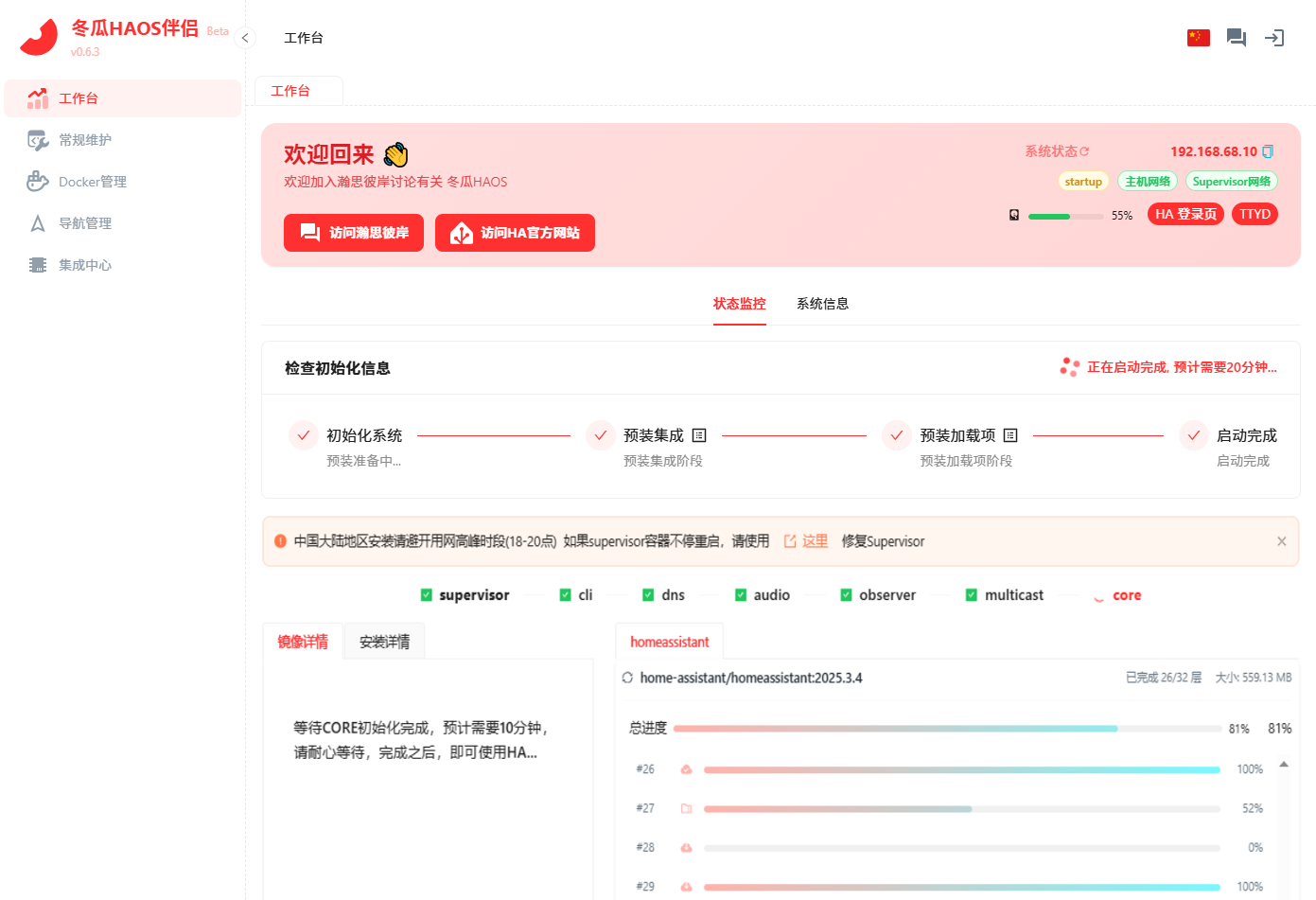 2、在浏览器中输入http://homeassistant.local:8124查看HA的安装进度。