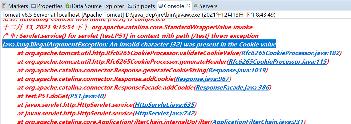 java.lang.IllegalArgumentException: An invalid character [32] was present in the Cookie value,翻译大白话就是:一个无效字符”32“在cookie的值中;