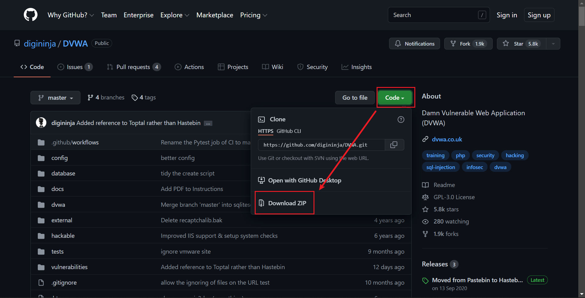 1. 于Github上下载压缩包【https://github.com/ethicalhack3r/DVWA】
