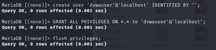create user 'dvwauser'@'localhost' IDENTIFIED BY ''; 创建用户,密码为空