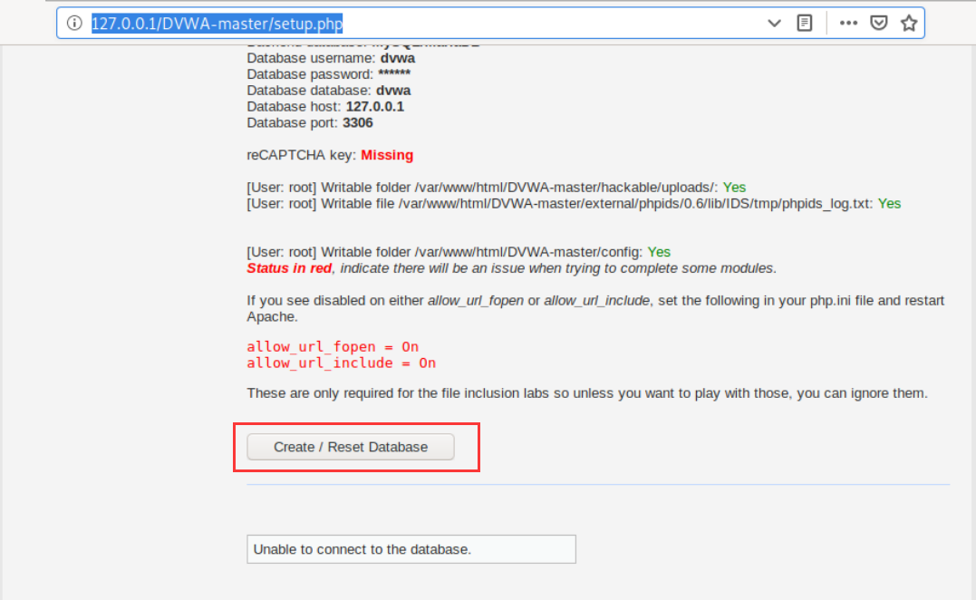 会自行访问 http://127.0.0.1/DVWA-master/setup.php