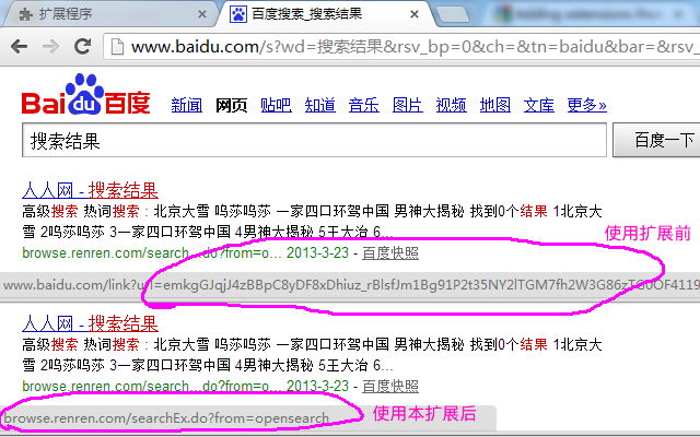 看到百度搜索结果的恶心网址,总是不爽,于是花了点时间写了个Chrome扩展,自动修正这些链接。