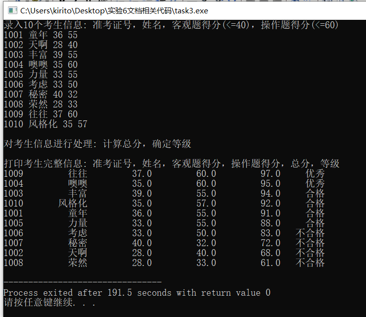 printf("\n打印考生完整信息: 准考证号,姓名,客观题得分,操作题得分,总分,等级\n");