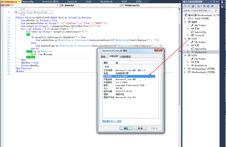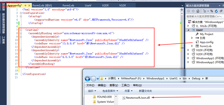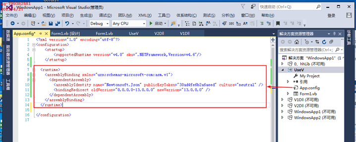 - 通过修改App.config文件对Newtonsoft.Json.dll重新定向,若遇到版本低于新版本的话,这定向到新版本: