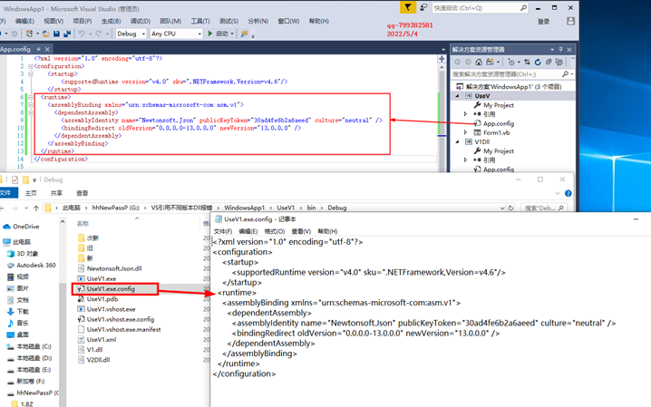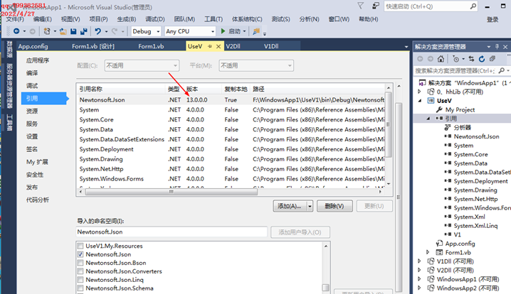 - 在使用项目引用V1的dll,然后再Debug中放入新版本的Newtonsoft.Json.dll(该项目中没有引用任何版本的Newtonsoft.Json.dll),有时可能在 使用项目中需要用到新的dll