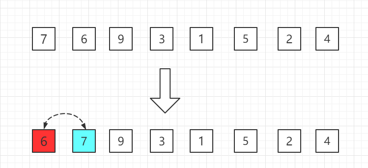 第一轮:从第二位置的 6 开始比较,比前面 7 小,交换位置。