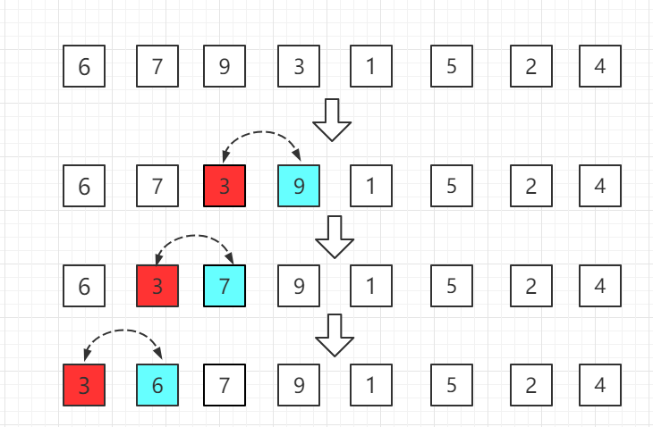 第三轮:第四位置的 3 比前一位置的 9 小交换位置,依次往前比较。