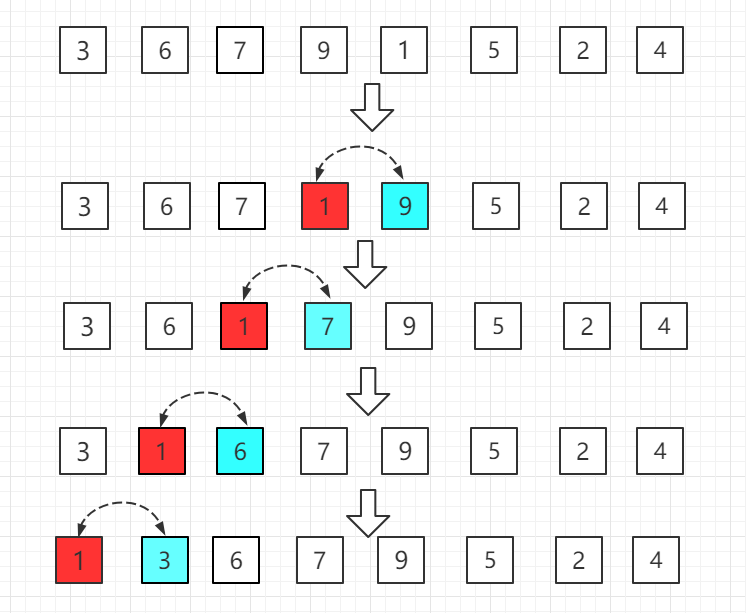 第四轮:第五位置的 1 比前一位置的 9 小,交换位置,再依次往前比较。