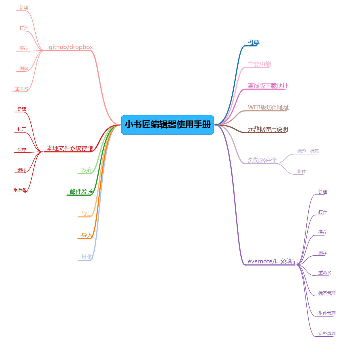 - 第三方同步。浏览器存储, 本地文件系统存储, dropbox, evernote, 印象笔记,gitoschina, 为知笔记, github等多种存储方案,保证了用户数据的安全,也让用户在存储方案上有了更多的选择。