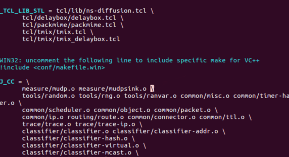 3.ns-allinone-2.35/ns-2.35/Makefile,找到OBJ_CC这一行, 在其下行添加代码measure/mtcpsink.o measure/mudp.o measure/mudpsink.o