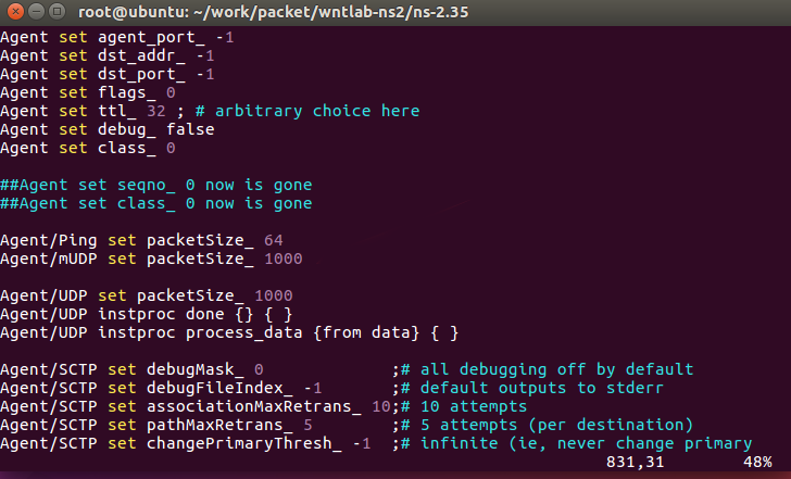 4./ns-allinone-2.35/ns-2.35/tcl/lib/ns-default.tcl,找到Agent/Ping set packetSize_ 64这一行,在其下一行添加Agent/mUDP set packetSize_ 1000.