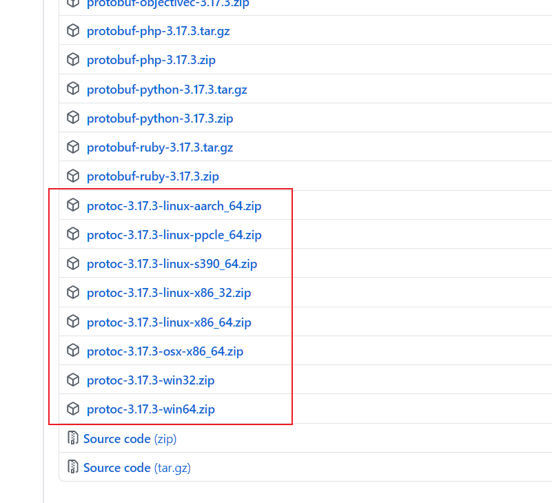 - 下载 protoc 编译器:protobuf,选择合适的平台,解压后将可执行文件加入环境变量,此编译器用来编译服务定义文件 .proto 生成指定语言的目标代码,这些代码用来实现 gRPC 服务以及客户端 stub