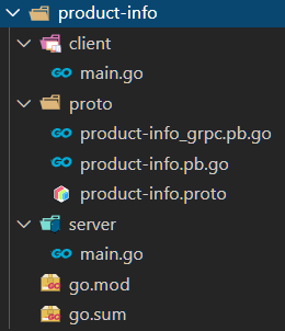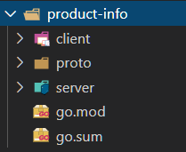go mod init product-info初始化模块。当然这里只是示例程序,实际场景中服务代码和客户端代码一般都不在同一个机器上,更不可能在同一个模块下了,最终目录结构如下: