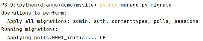 运行makemigrations命令让django检测我们对模型文件的修改,并把修改的部分存储为一次迁移,存储在polls/migrations/0001_initial.py中: